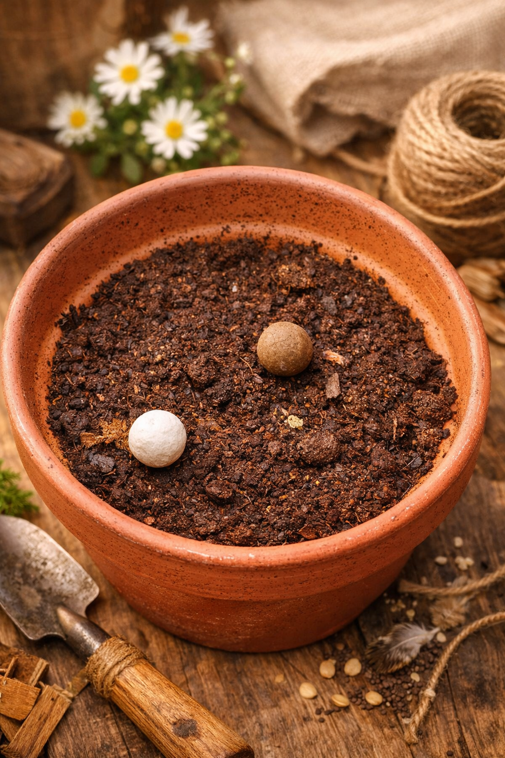 1️⃣ Aseta siemenpallo mullan päälle tai kevyesti pintaan