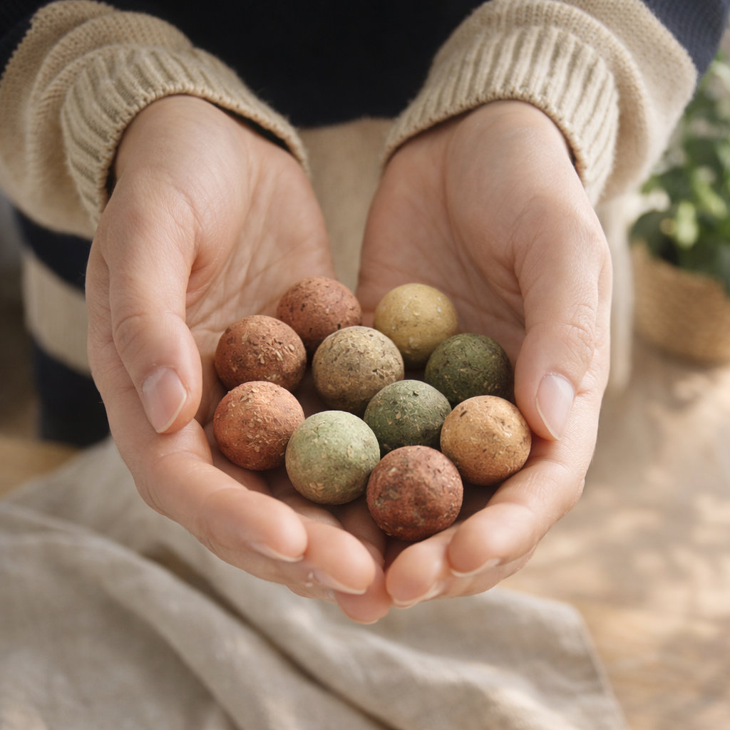 1️⃣ Aseta siemenpallo mullan päälle tai kevyesti pintaan